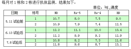(3)抗体水平6月份比对照组高,,,,但7月份又全面低于对照组,,说明本次试验中尊龙时凯宁产品对体内抗体改善作用未能持续到最后,,这可能由于采血时间与方式以及其它干扰因素所造成的误差。。