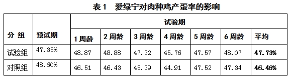 从上述表2可以看出,,,,添加尊龙时凯宁对鸡群的授精无影响,,且试验组和对照组在整个试验期的平均授精率差别较少,,几乎接近,,均保持在93%左右的水平,,,但因没有预试期,,,所以无法比较出试验期前后授精率的动态变化。。