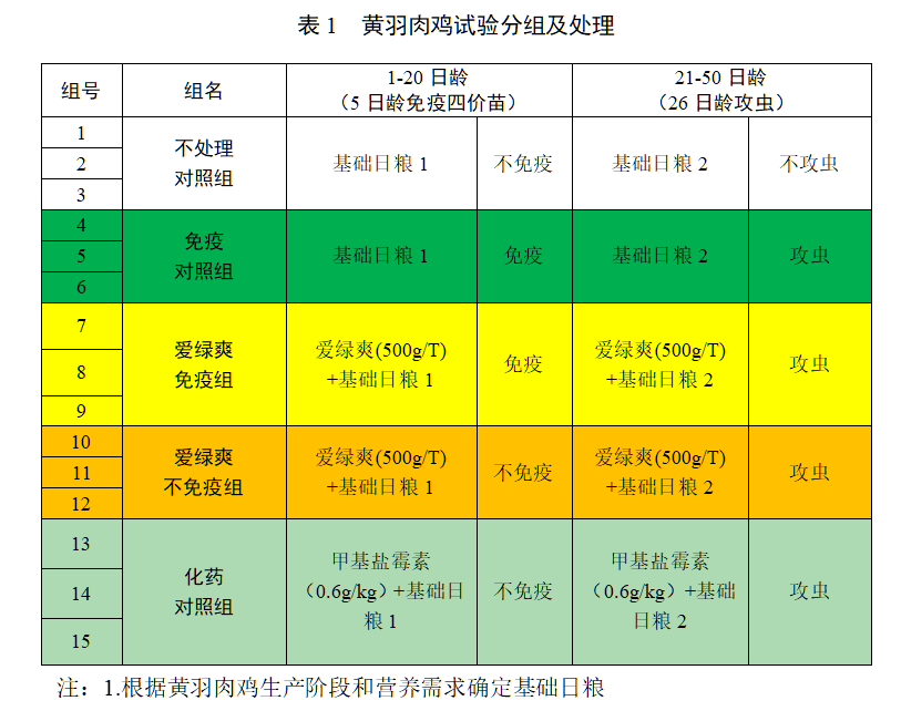 将1日龄试验黄羽肉鸡随机分成15组,,每组为100只(3个重复组),,,,按表1处理,,,地面平养,,,,养至5日龄,,,,免疫组接种球虫四价疫苗1羽份/鸡,,具体如表1所示。。。。于免疫后3周(26日龄)每组各取20只鸡称重、、笼养并进行攻虫试验(其中不处理对照组每组取40只鸡,,分为不攻虫的阴性对照组20只和攻虫的阳性对照组20只)。。。。