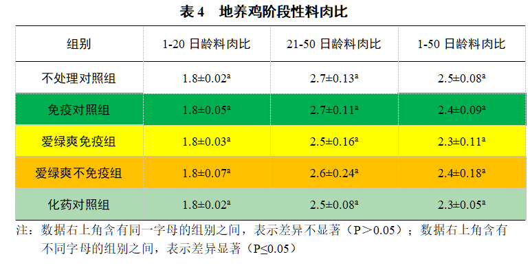 表4数据显示,地养鸡1-20日龄料肉比并无差异;21-50日龄料肉比由低到高为尊龙时凯爽免疫组=化药对照组<尊龙时凯爽不免疫组<免疫对照组=不处理对照组,,这说明尊龙时凯爽和疫苗联合使用提高了料肉比。。